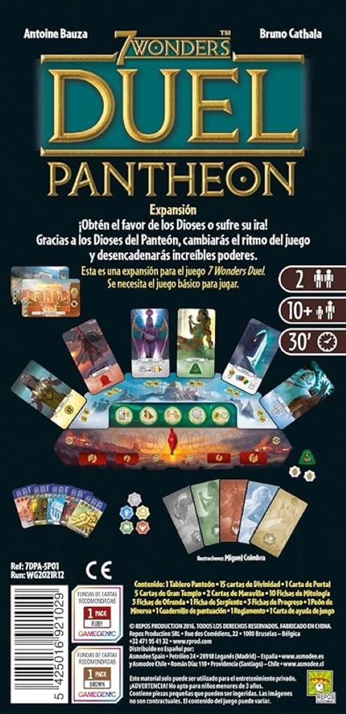 La expansión Pantheon para 7 Wonders Duel, aleja su mirada de la raza humana para centrarse en los seres que verdaderamente gobiernan nuestros destinos junto con toda la creación: los dioses. Tu objetivo, y el de tu oponente, será hacerte con el favor de las deidades de cinco civilizaciones de la Antigüedad. De este modo, en la tercera de las Edades que recorre el juego, tienes que construir grandes templos y realizar otras acciones que dejen clara tu adoración por los dioses.