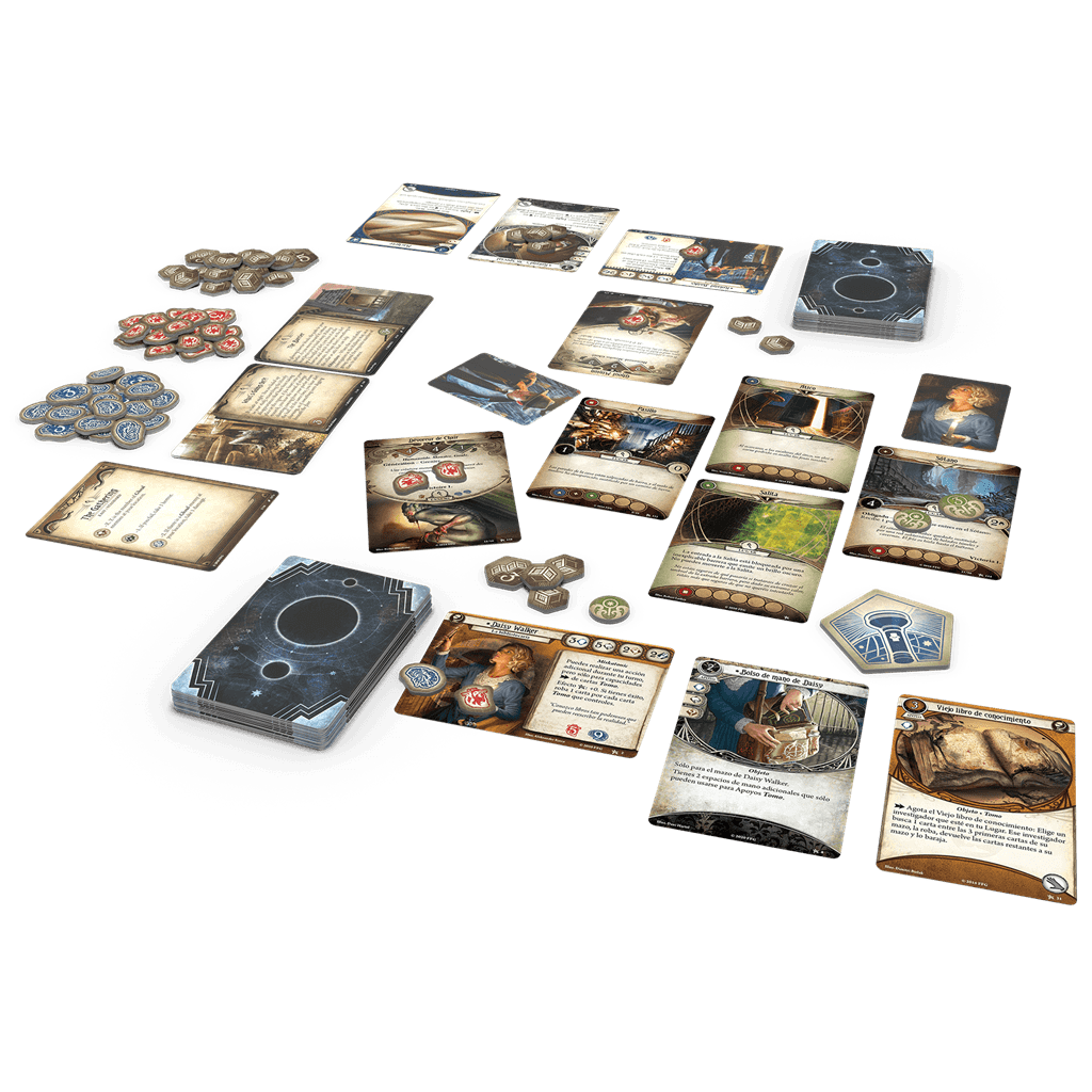 5 cartas de Investigador • 5 cartas pequeñas • 111 cartas de Escenario • 245 cartas de Jugador • 61 fichas de Recursos • 44 fichas de Caos • 27 fichas de Horror • 40 fichas de Daño • 57 fichas de Pista/Horror • 1 guía de campaña • 1 reglamento para aprender a jugar • 1 guía de referencia de reglas.