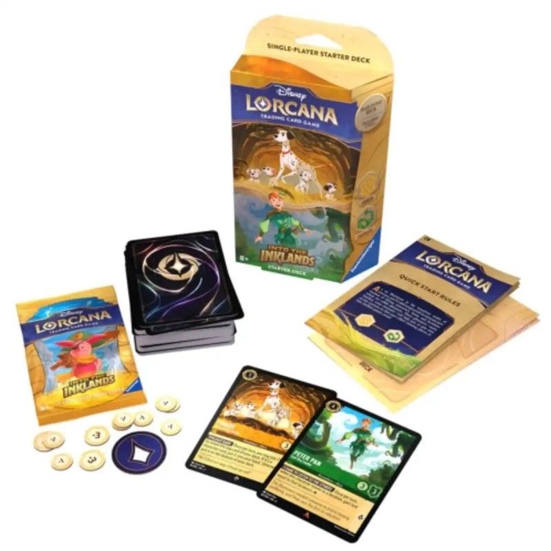 Los mazos de inicio, listos para jugar, contienen un mazo preconstruido con una lista específica de 60 cartas. Si eres nuevo en el mundo de los juegos de cartas coleccionables o si quieres experimentar el juego con un mazo diseñado y probado por el Equipo Disney Lorcana, esta es la mejor forma de empezar.