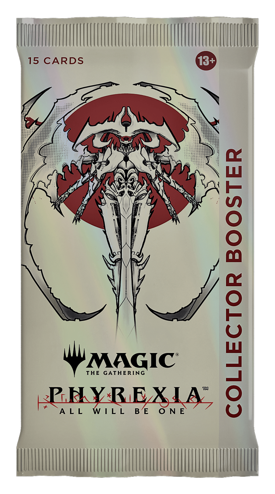 Each Phyrexia: Alles wird eins Sammler-Booster contains 15 Magic: The Gathering cards and 1 Traditional Foil double-sided Token, with a combination of 5–6 cards of rarity Rare or Mythic Rare and 2–5 Uncommon cards, 4–7 Common cards, and 1 Land card. Every Booster contains a total of 10 Traditional Foil cards. Foil Borderless Mythic Planeswalker in 3% of Boosters.