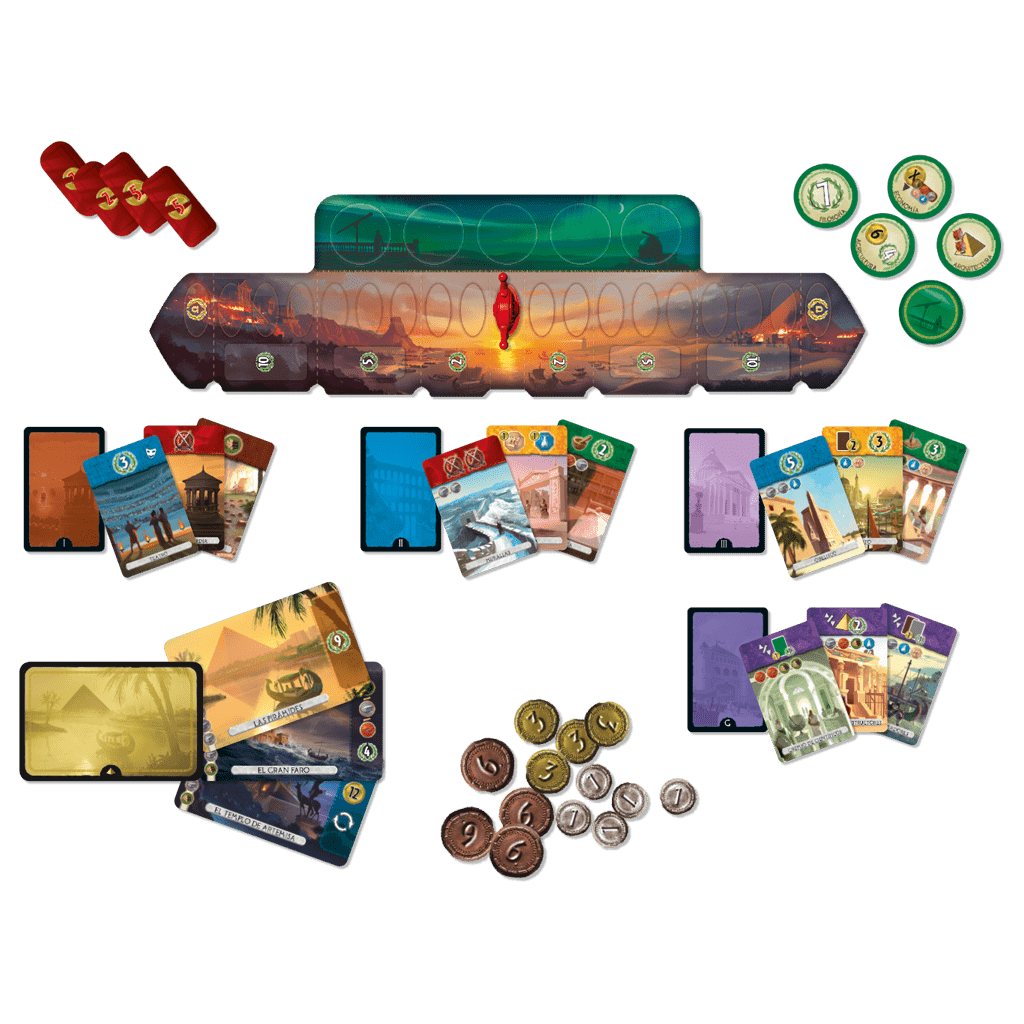 1 tablero, 23 cartas Era I, 23 cartas Era II, 20 cartas Era III, 7 cartas de Gremio, 12 cartas de Maravilla, 4 fichas Militares, 10 fichas de Progreso, 1 medidor de Conflicto, 31 monedas (14 de valor 1, 10 de valor 3 y 7 de valor 6), 1 cuadernillo de puntuaciΓ³n, 1 hoja resumen y 1 reglamento.