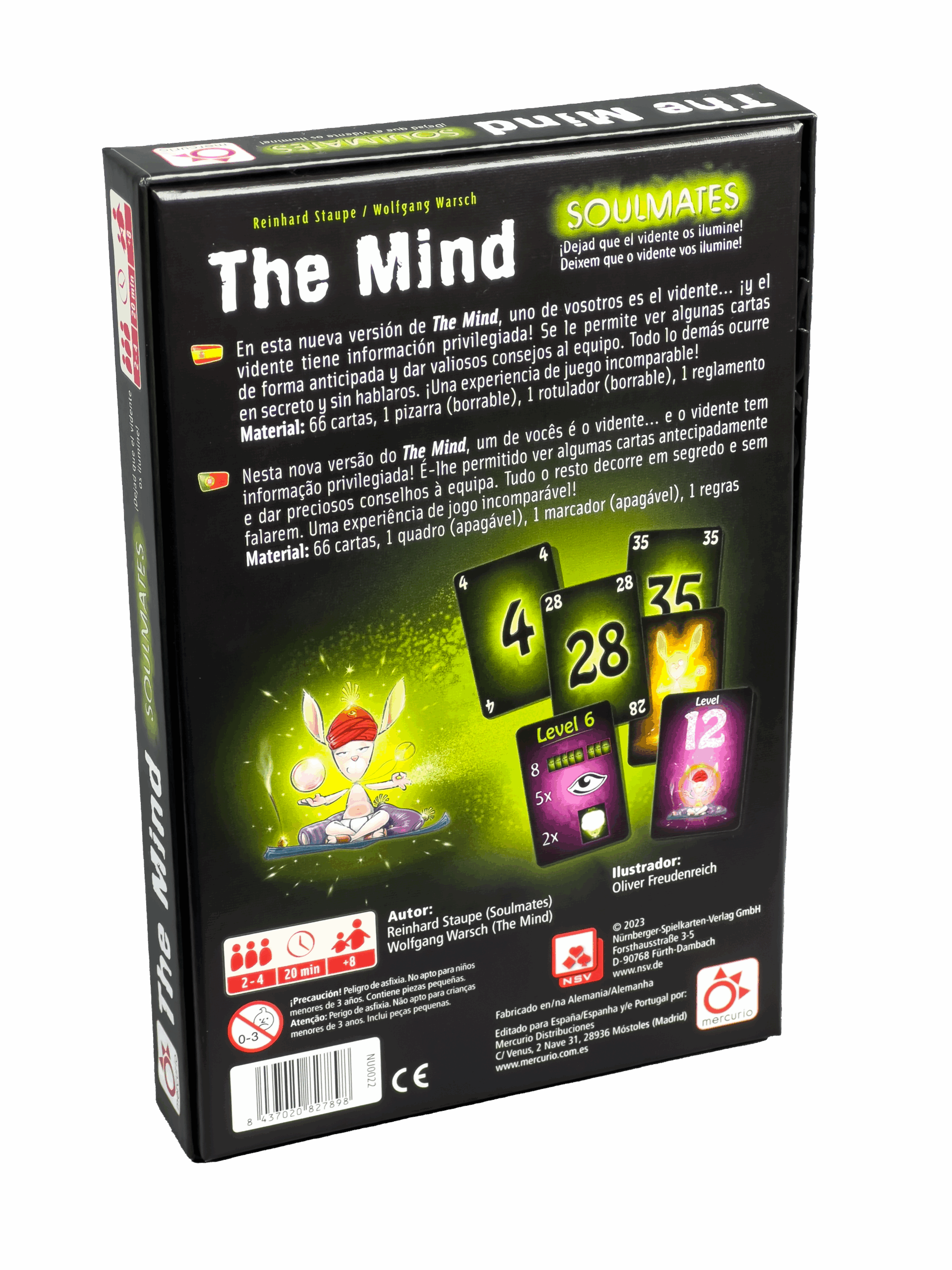 ¡Dejad que el vidente os ilumine! En esta nueva versión de The Mind, las cartas se juegan boca abajo y uno de vosotros es el vidente, ¡y el vidente sabe más! Se le permite ver algunas cartas de antemano y dar valiosos consejos al equipo usando la pizarra. Todo lo demás ocurre en secreto y sin hablaros, igual que en el premiado juego The Mind. ¡Tú creas el milagro sólo con tus pensamientos! ¡Una experiencia de juego incomparable!