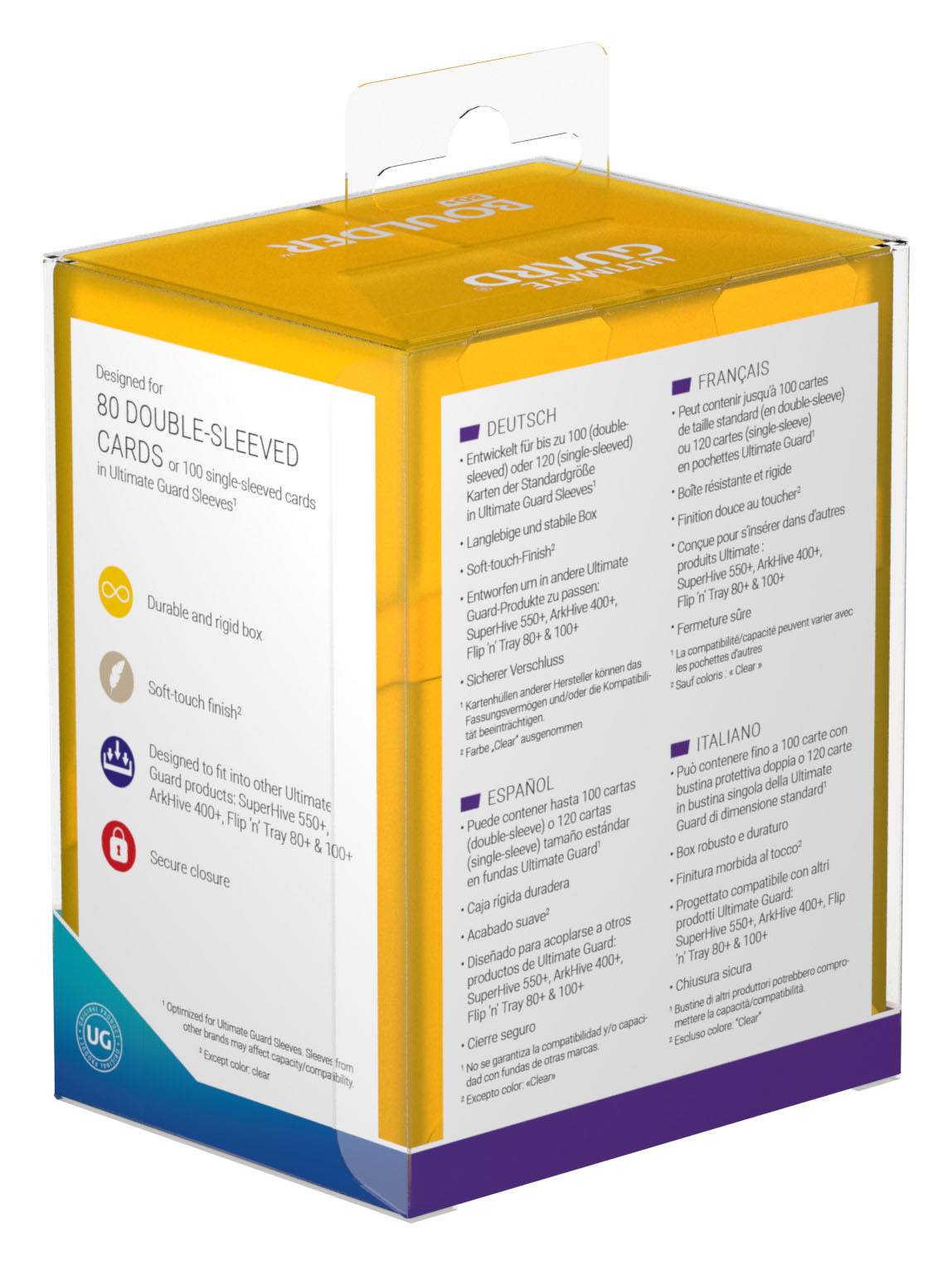 • Puede contener hasta 80 cartas (doble funda) o 100 cartas (funda única) tamaño estándar en fundas Ultimate Guard*