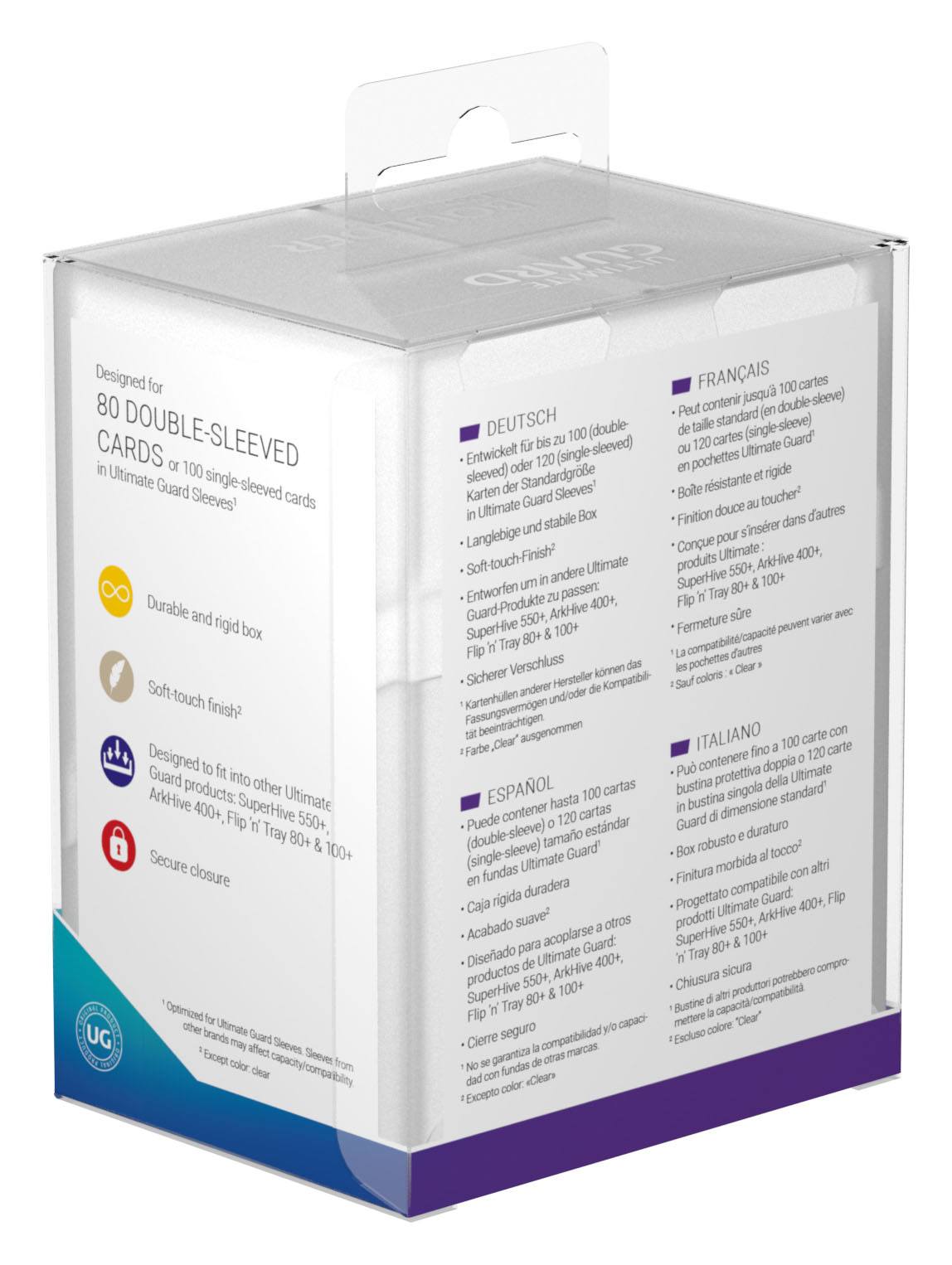 Caja solida de cartas práctica y compacta con una superficie agradable al tacto y de fácil apertura. Puede contener hasta 80 cartas de doble funda1. Diseño modular que encaja perfectamente con las cajas Flip’n’Tray y Arkhive.