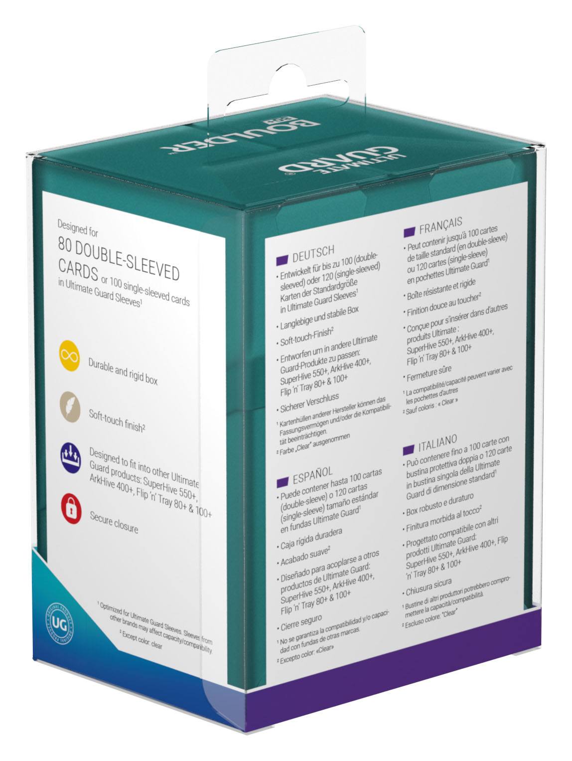 - Diseñado para acoplarse a otros productos de Ultimate Guard: Superhive 550+, Arkhive 400+, Arkhive 800+, Smarthive 400+, Flip’n’Tray 80+, Twin Flip’n’Tray 160+