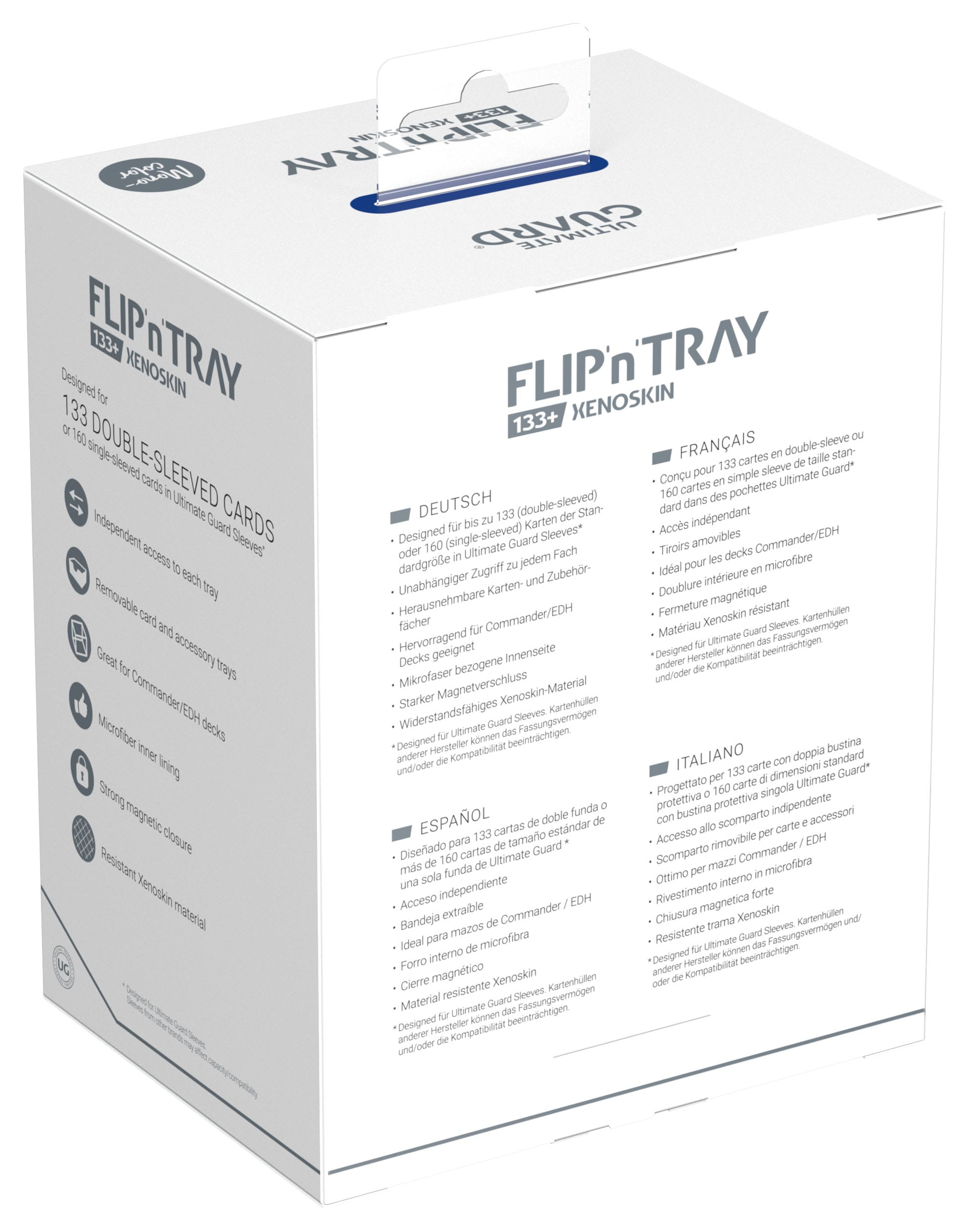 La última versión de la legendaria Flip’n’Tray de Ultimate Guard ofrece aún más espacio: La Flip’n’Tray 133+ Xenoskin tiene capacidad para 133 cartas de doble funda, gracias al compartimento extra integrado para dados, la caja de cartas es perfecta para mazos de Commander/EDH o es la compañera óptima para los jugadores de Magic: The Gathering en eventos de Limited. Pero a los fans de otros TCG como Pokémon o Flesh and Blood también les encantará la espaciosa y práctica caja de cartas con nuestra probada superficie Xenoskin.