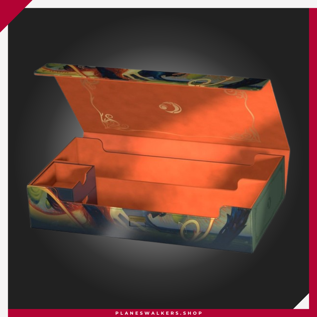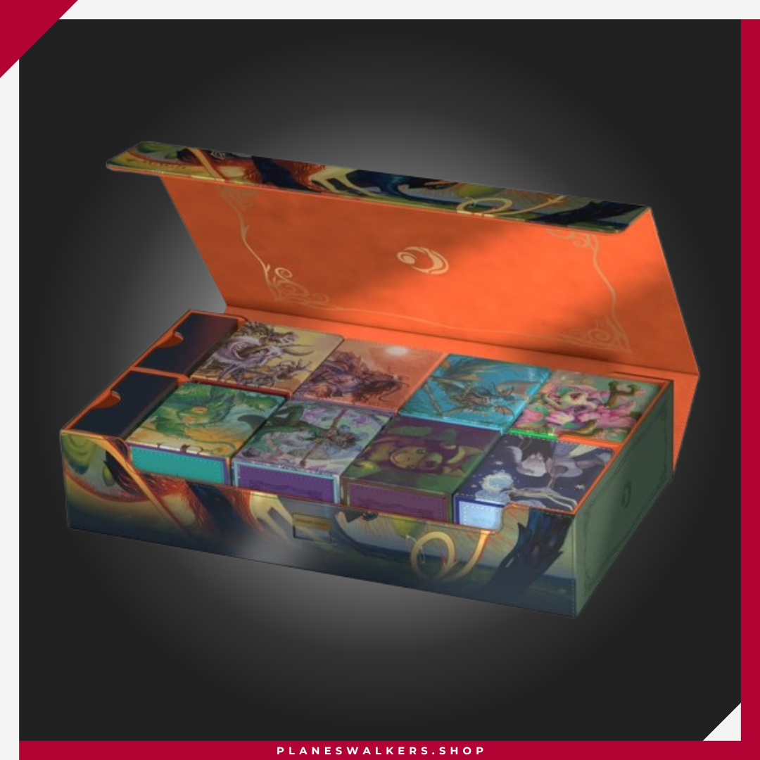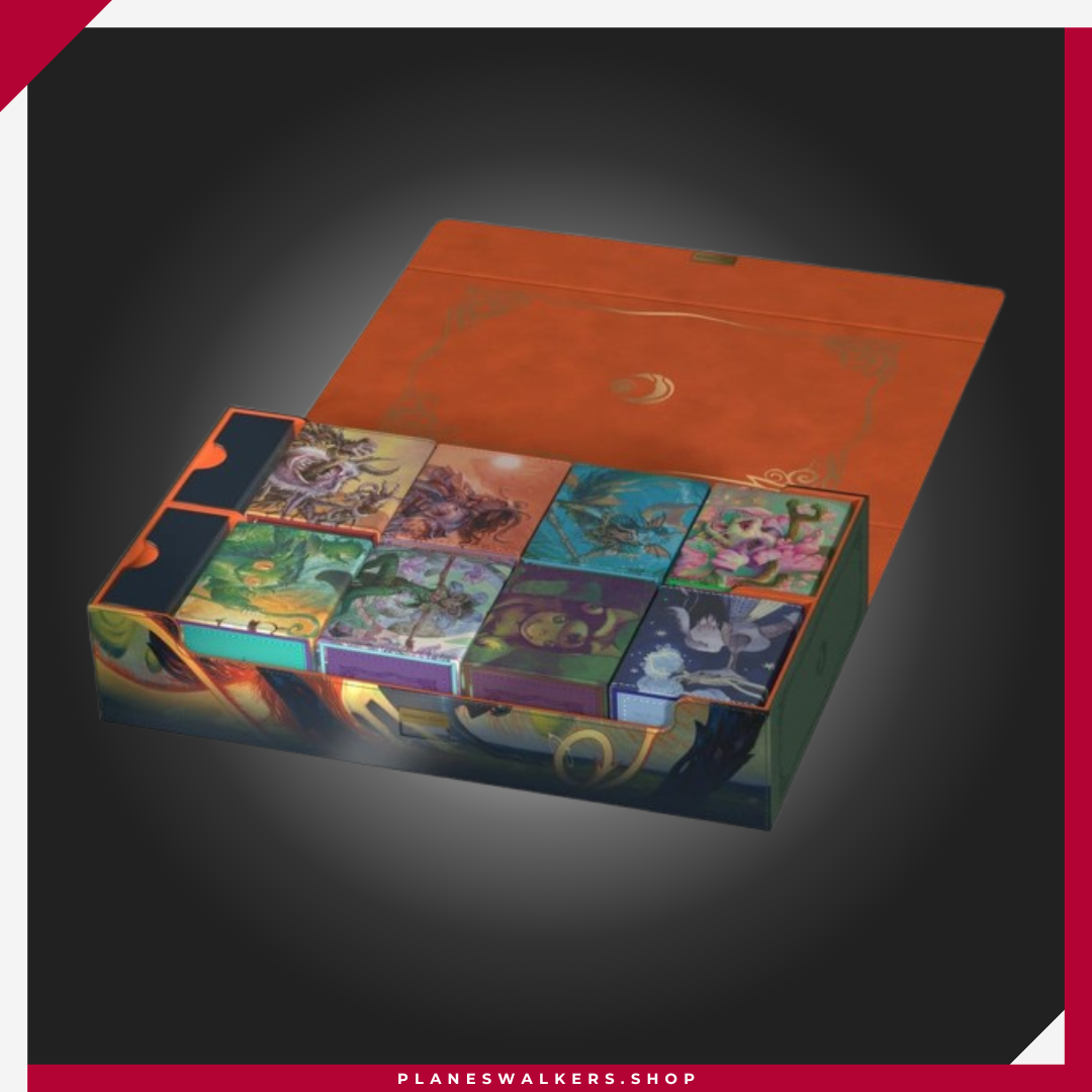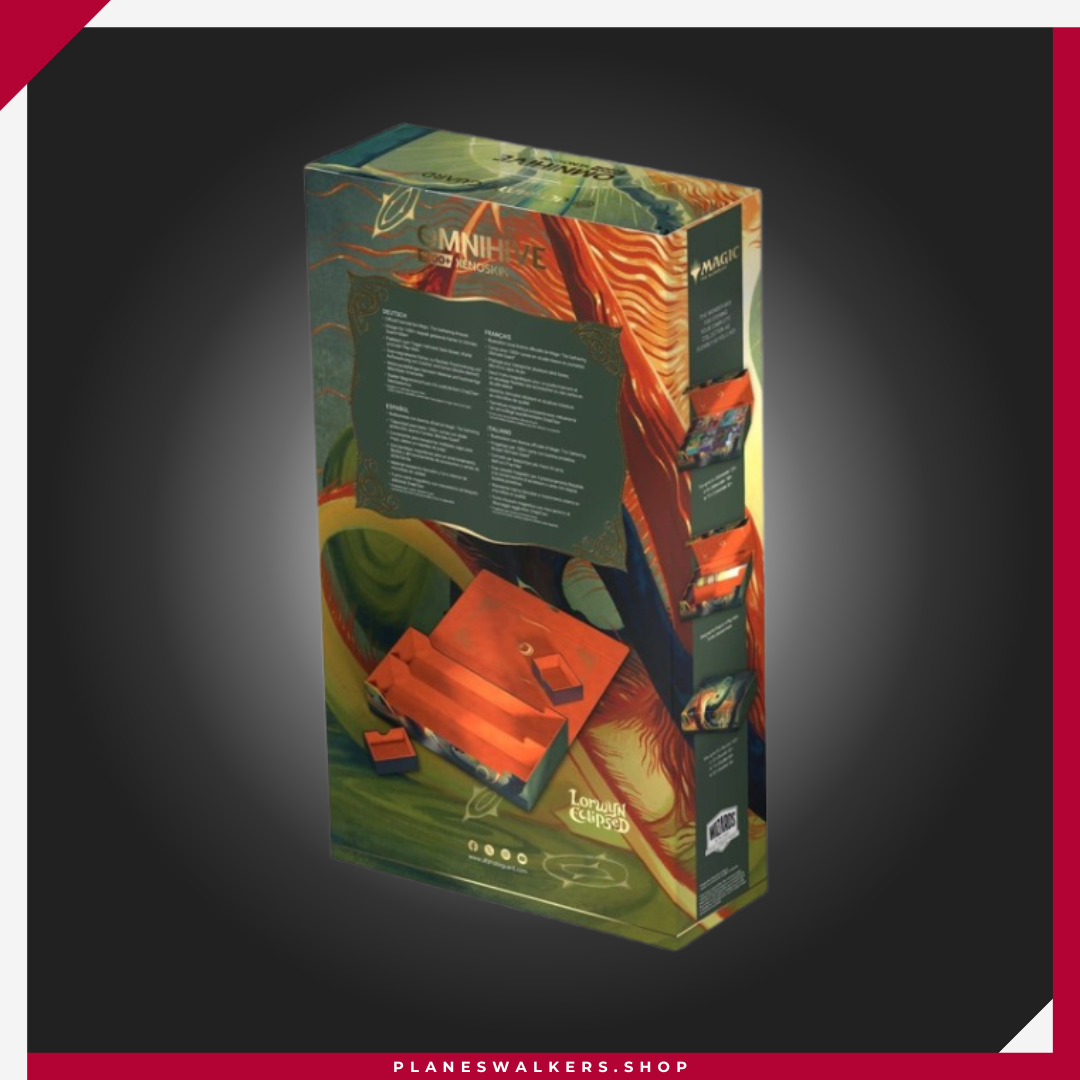 El Omnihive 1000+ Xenoskin de Ultimate Guard, con ilustraciones con licencia oficial del set «Lorwyn Eclipsed» de Magic: The Gathering, es la caja de almacenamiento masivo MTG definitiva para mazos, cartas y accesorios. Diseñada para guardar simultáneamente varias cajas para mazo y/o tapetes, cuenta con dos bandejas magnéticas para dados, apilables y de posición flexible, situadas sobre dos compartimentos, además de material Xenoskin resistente, un forro interior de microfibra de alta calidad, un cierre magnético fuerte y el fiable mecanismo ZnapClaw de Ultimate Guard. Con capacidad para ocho Sidewinder 100+ o seis Sidewinder 133+, el Omnihive 1000+ Xenoskin también puede albergar hasta 1000 cartas doblemente enfundadas en fundas Ultimate Guard*, lo que lo convierte en la caja ideal para un cube.